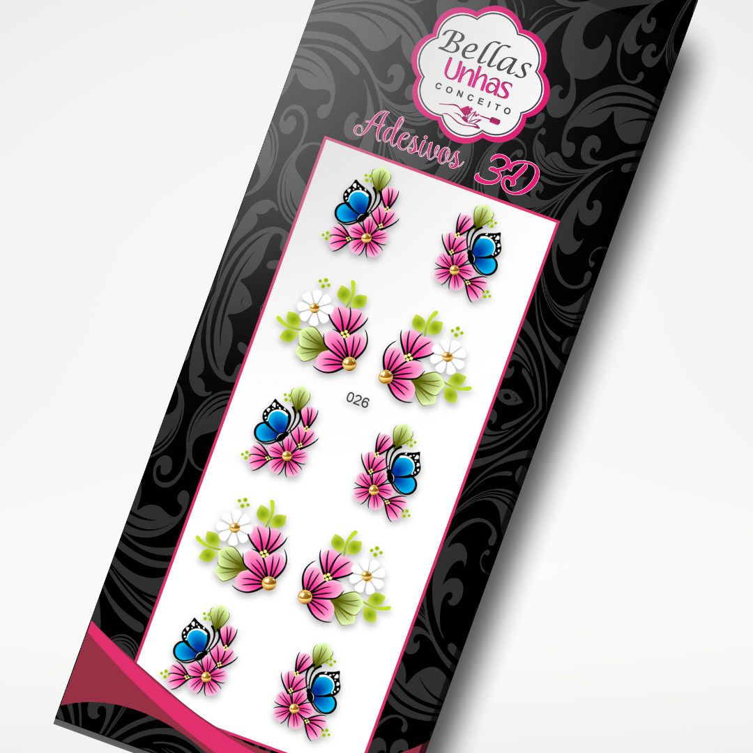 Adesivo para Unha - Flores Rosa e Borboletas Azuis